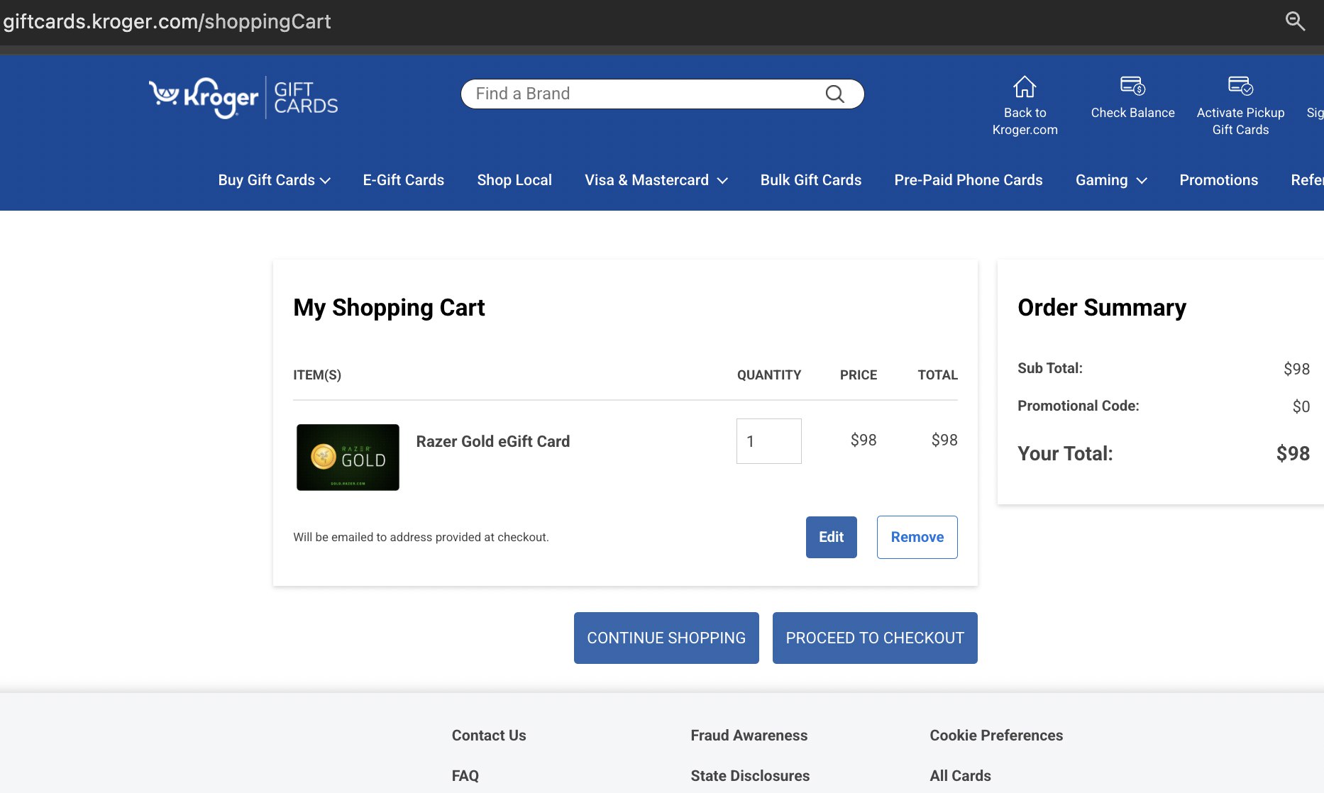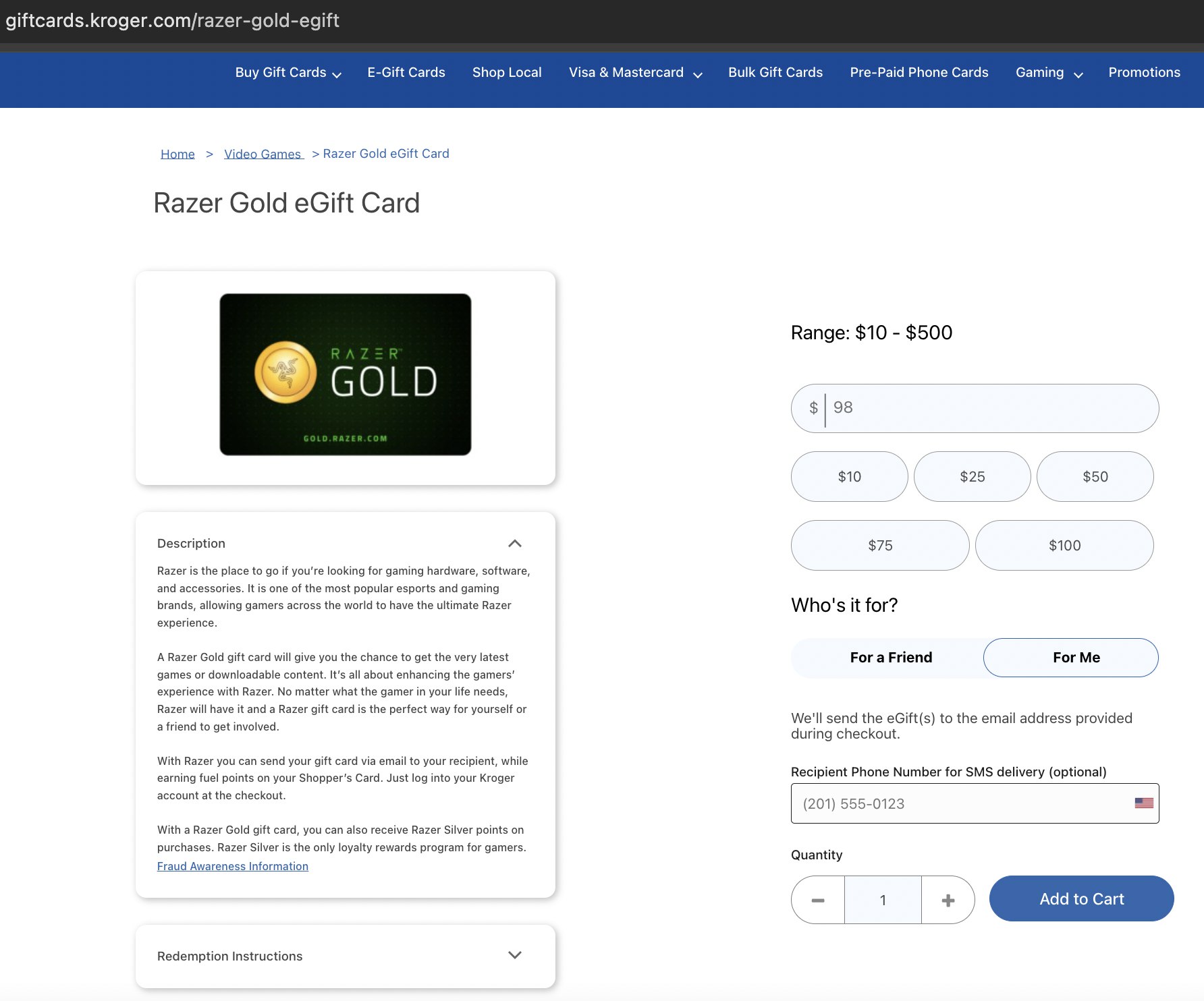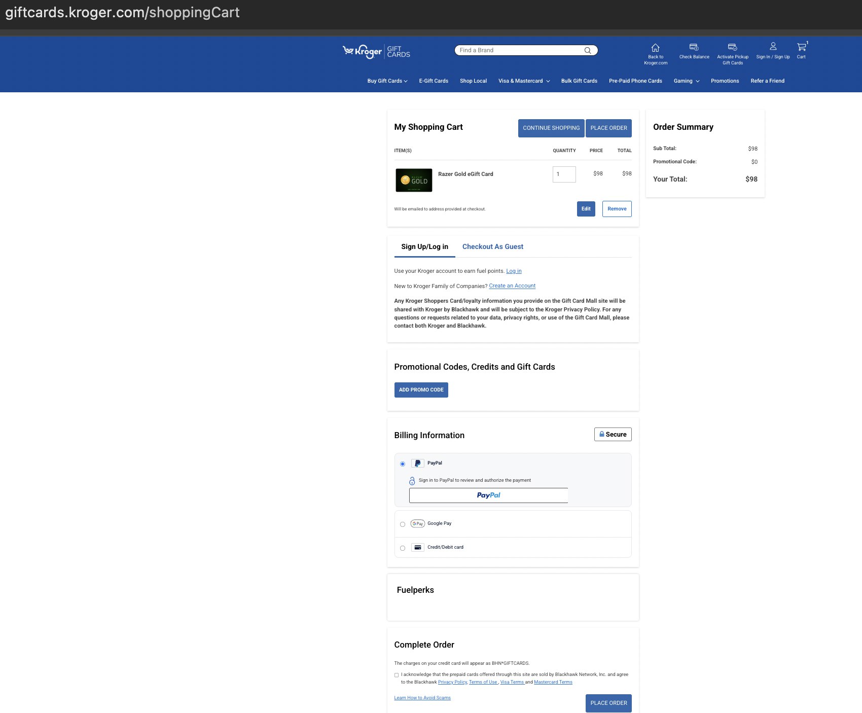 The below steps are provided to buy a Razer Gold giftcard for any amount via Paypal from Kroger.com.